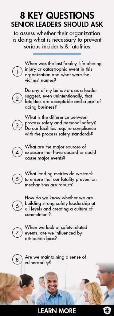 Catastrophic events need not happen. Leaders who review and understand the right metrics, ask the right questions, focus on creating a culture of engagement and create the right tension around vulnerability are doing the things necessary to align their organizations for injury-free performance. By following the guidelines presented, senior leaders can look closely in the mirror and feel confident that they are doing what is necessary to provide proper oversight and sponsorship for prevention.